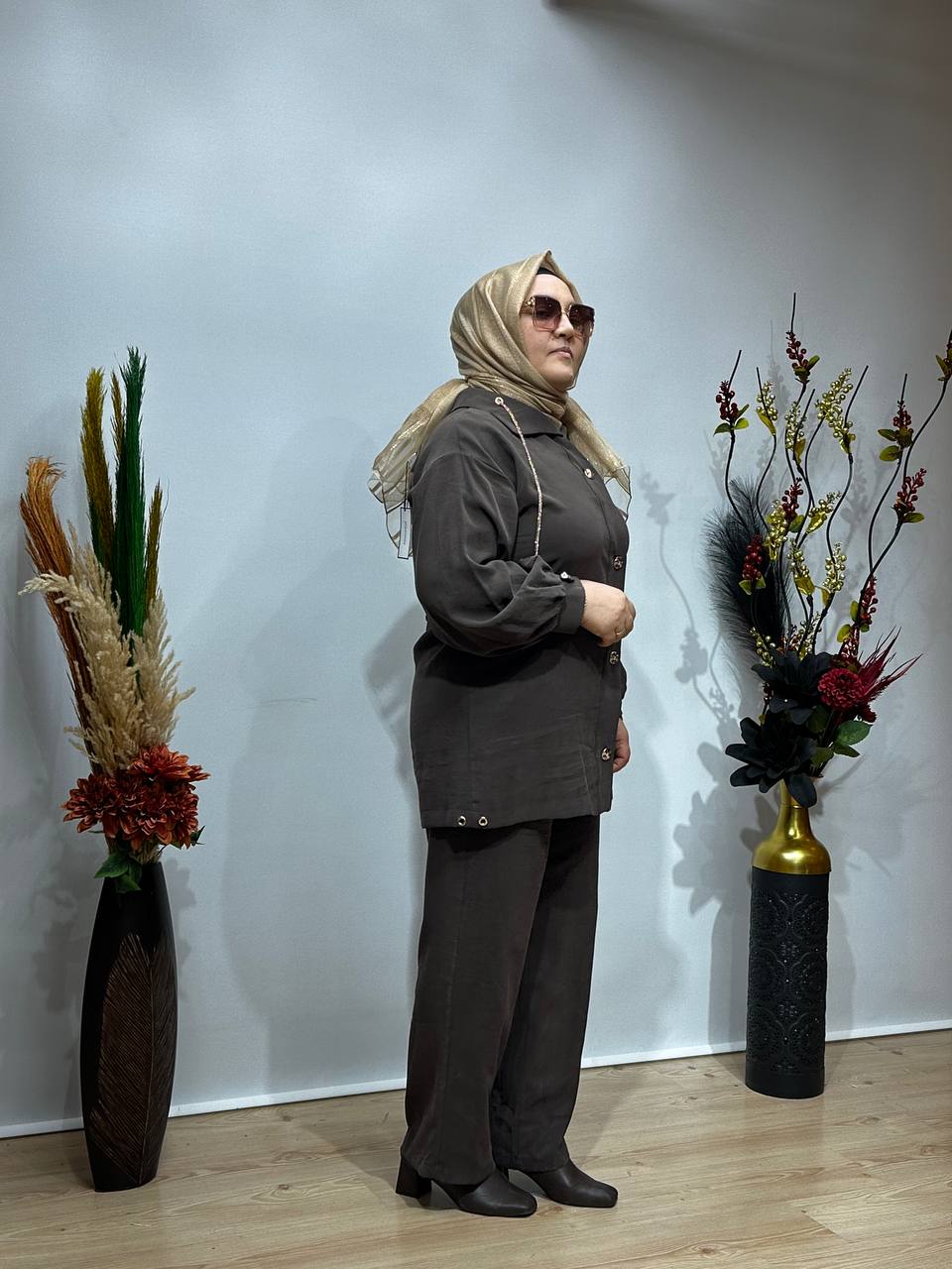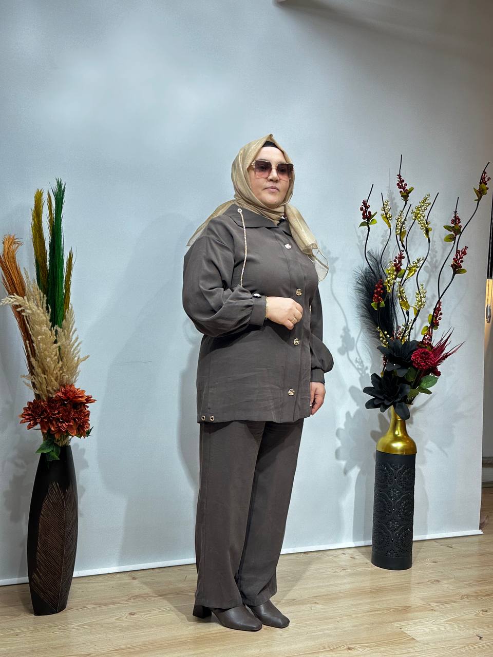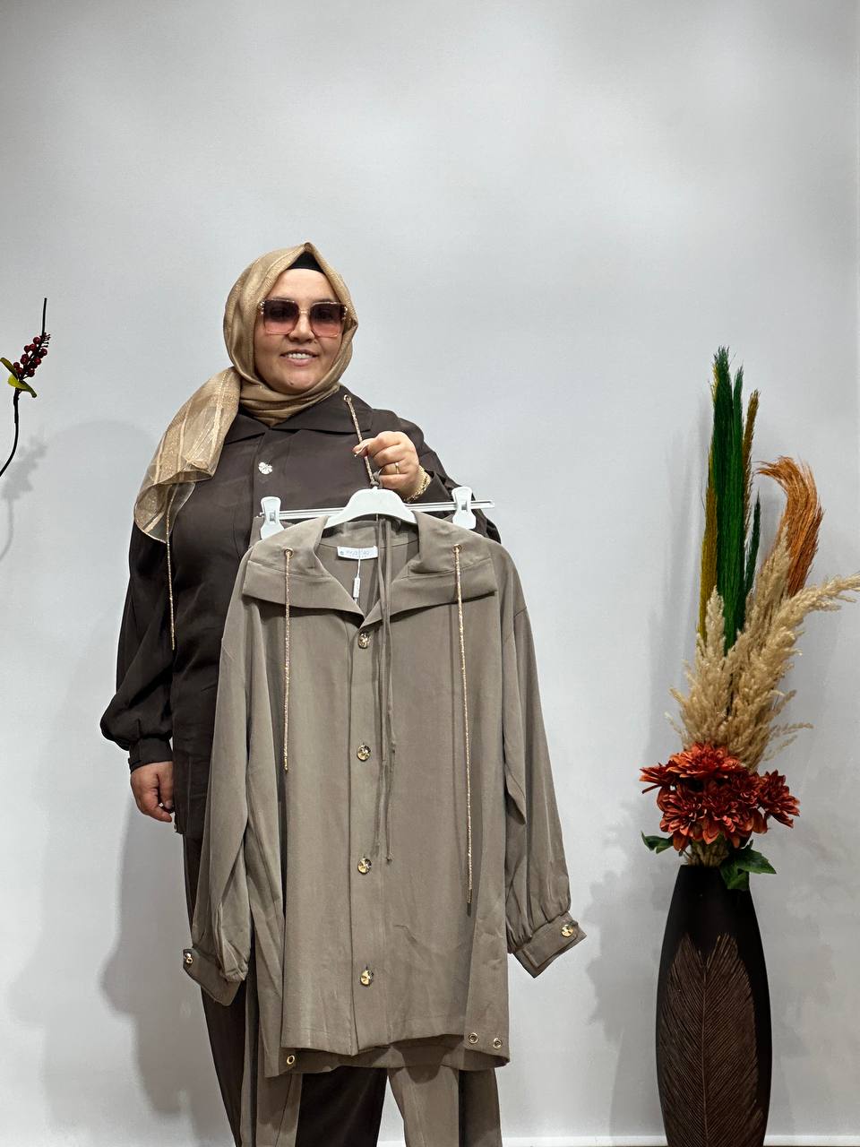Takım; oversize rahat kesim üst parça ve aynı tonlarda zarif pantolonuyla hem günlük kullanımda hem özel davetlerde kusursuz bir görünüm sunar.