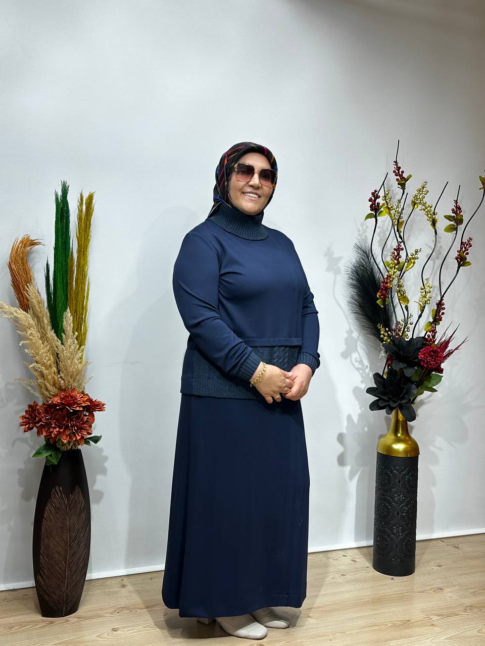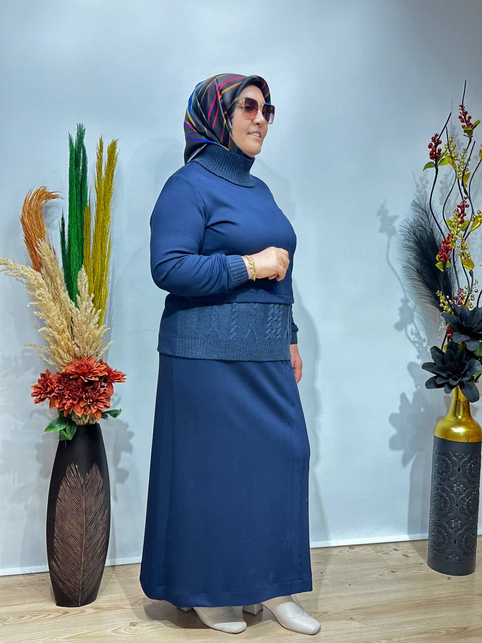 Uzun etek formu akışkan yapısıyla hem toparlayıcı hem de çok zarif durur.